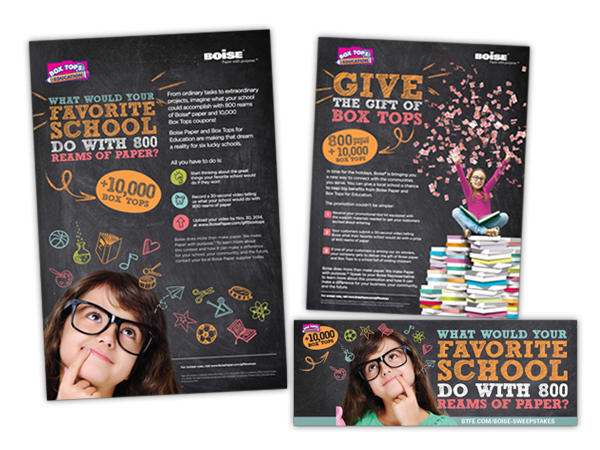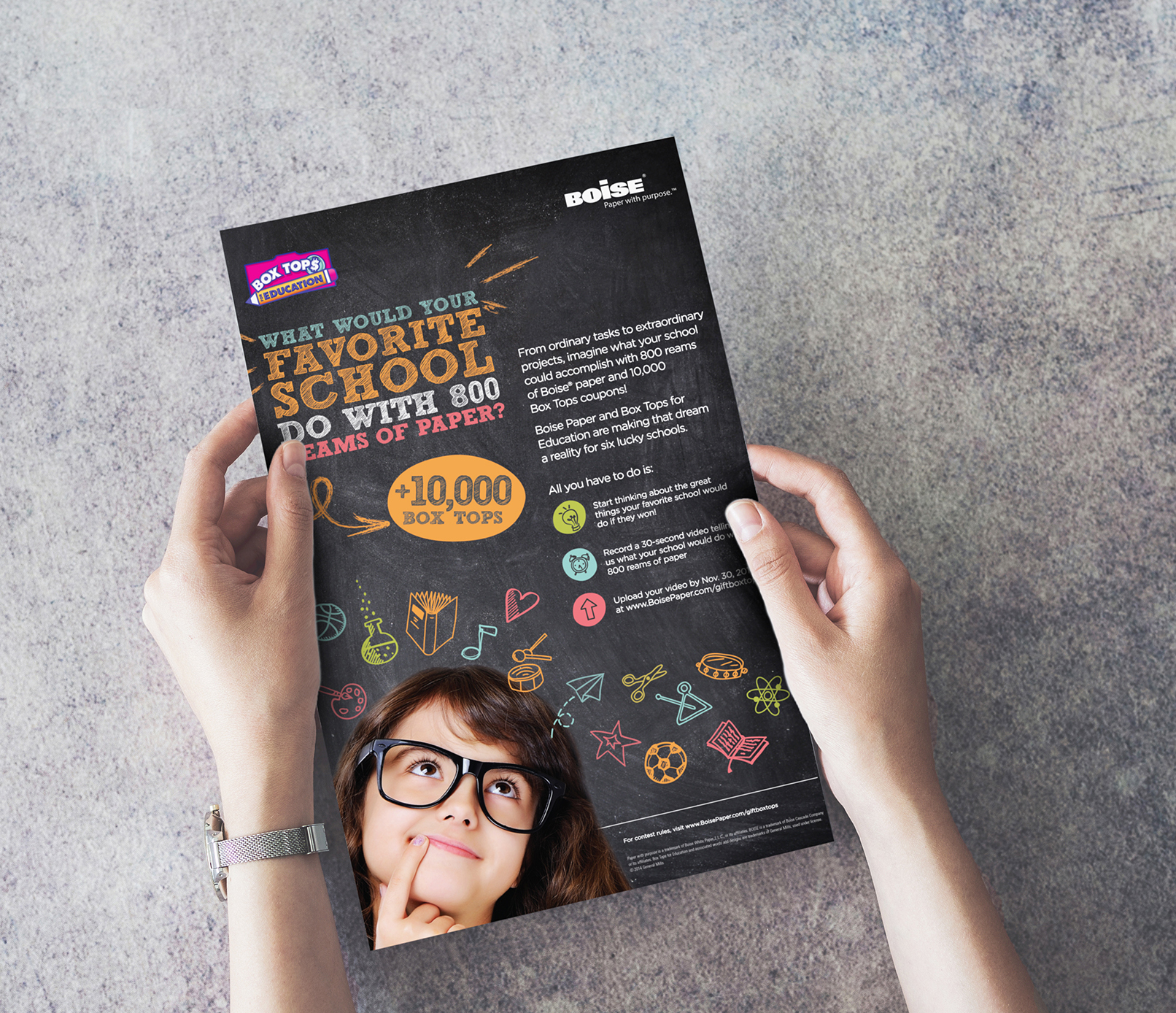Promoting a winning initiative. Box Tops for Education™ is a leading program that helps support education and America’s schools. Boise Paper is excited to be the exclusive office paper brand that participates in Box Tops, and is proud to help K-8 schools earn money for essential supplies. Evoke has been a creative partner in developing many of Boise Paper’s Box Tops for Education marketing efforts such as promotional posters, sales flyers and digital marketing.