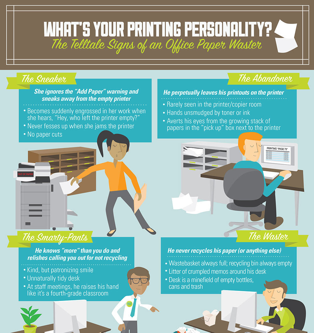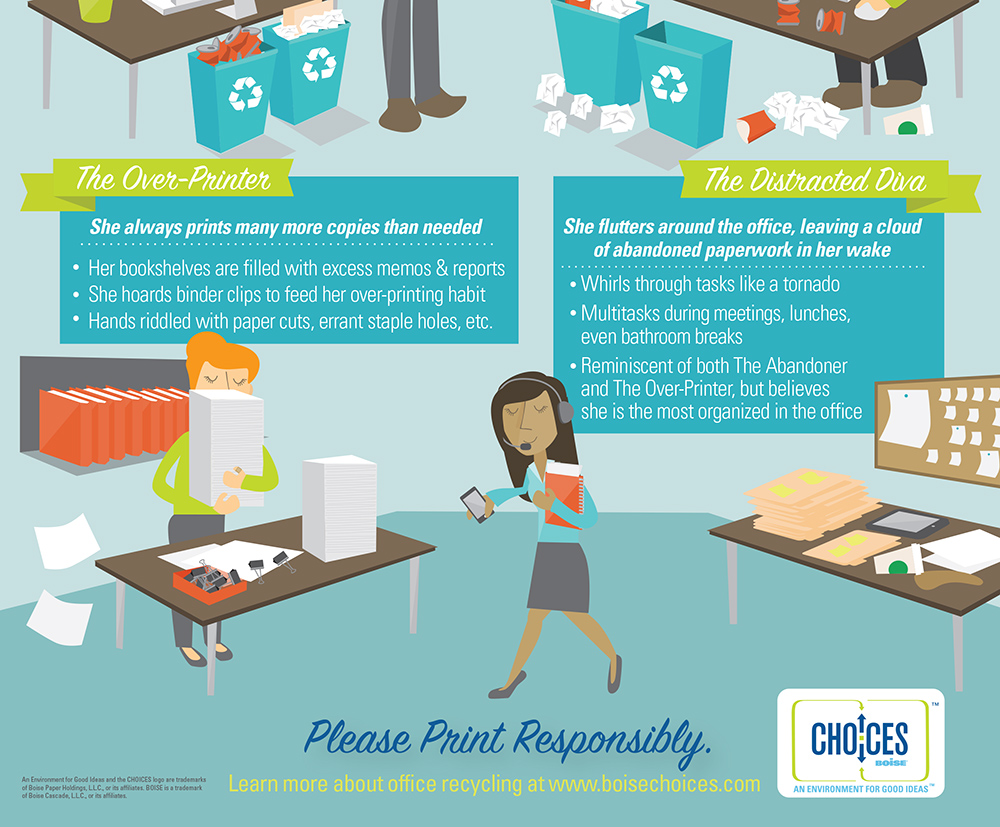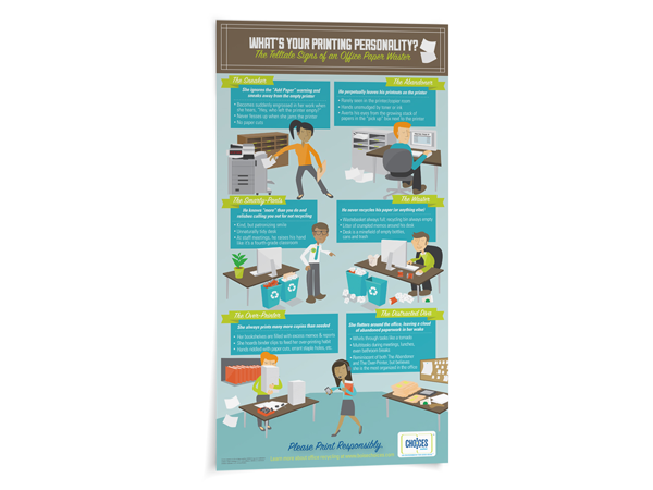 Creating awareness through humor. For Choices, a sustainability program by Boise Paper, Evoke crafted a custom infographic style poster that shined light on paper waste in office settings by outlining different paper personalities. This conversation starter was handed out at tradeshows and given to customers on sales visits.
