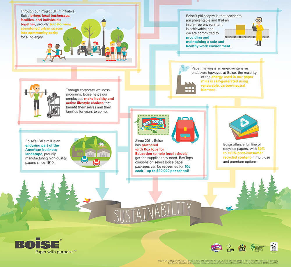 Telling a story in pictures. Boise is proud of their sustainable initiatives and wanted to showcase them in a visually pleasing and interactive way. This infographic was used on their website, distributed by their sales team and used as trade show display.